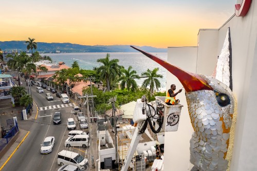 Montego Bay, Jamaica — Visitors arriving on Montego Bay’s famed Hip Strip now have a dramatic new welcome: a soaring 46-foot sculpture of Jamaica’s national bird, the streamer-tail hummingbird, affectionately known as the Doctor Bird. Perched on the façade of the award-winning S Hotel Montego Bay, the monumental work is both a bold declaration of Jamaican pride and a catalyst for cultural revival along Jimmy Cliff Boulevard.